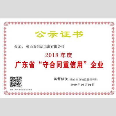 獎 項:"2018年度廣東省“重合同守信用”企業(yè) ——佛山市恒潔衛(wèi)浴有限公司"