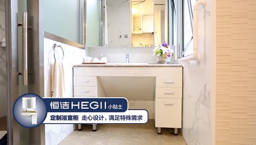 恒潔衛浴作為設計師選用的品牌,在了解了委托人的特殊情況后,為小李量身定制浴室柜,其鏡面有5度角的斜度,可以給輪椅使用者看到全身,同時也不影響普通人的使用,臺面下沿距離地面680mm,保證輪椅使用者的腿部有足夠的空間。