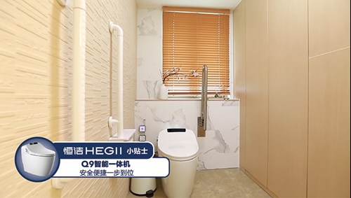 恒潔智能Q9坐便器同樣也為母子二人提供了便利,其獨有的一鍵旋鈕設計,讓操作化繁為簡,無需彎腰轉身,方便行動不便者進行操作;其接近感應功能,靠近蓋板便會自動翻開,給予貼心的使用體驗。此外坐便器搭配的U型扶手,更是便于小李在未來也能獨自上廁所。