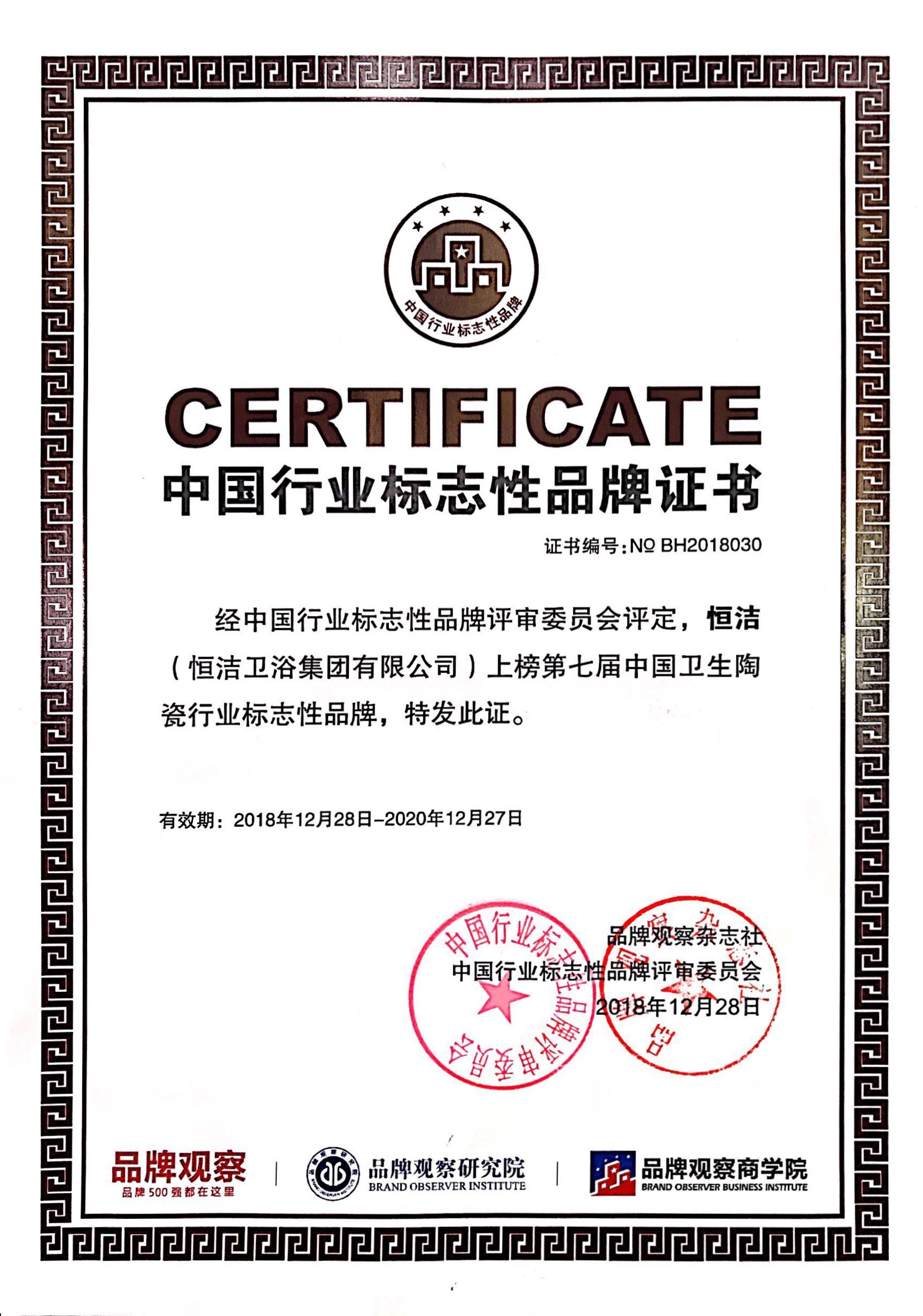 12月28日,由中國商業經濟學會、全國品牌社團聯席會、品牌觀察雜志社、品牌觀察研究院、品牌觀察商學院、北京國信品牌評價科學研究院聯合舉辦的第7屆中國行業標志性品牌頒獎儀式在福州舉行,恒潔榮膺行業唯一的「2018中國衛生陶瓷行業標志性品牌」,與同時上榜的華為、格力、方太等各自行業的標志性品牌一道,共顯中國品牌風采。