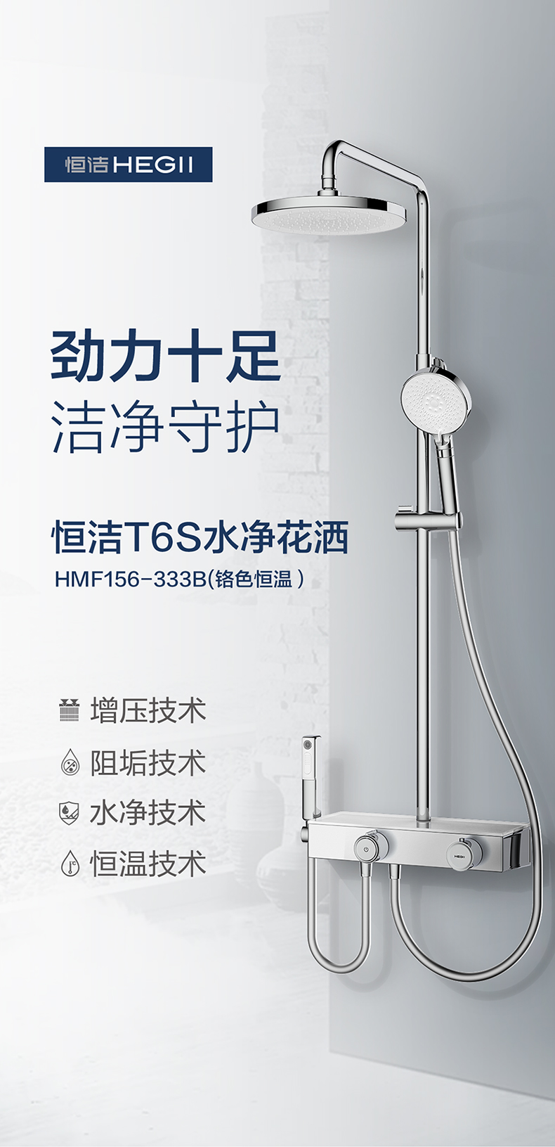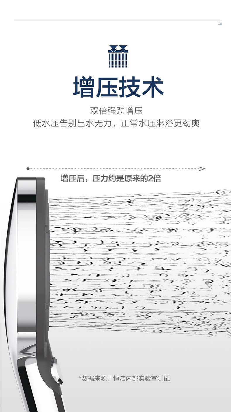 - 恒潔增壓技術,0.45mm極致細孔設計,出水密集柔和