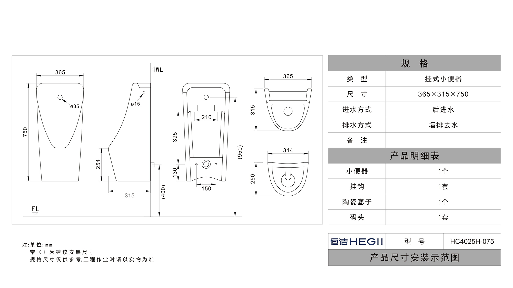 HC4025H-075一體感應式掛式小便斗